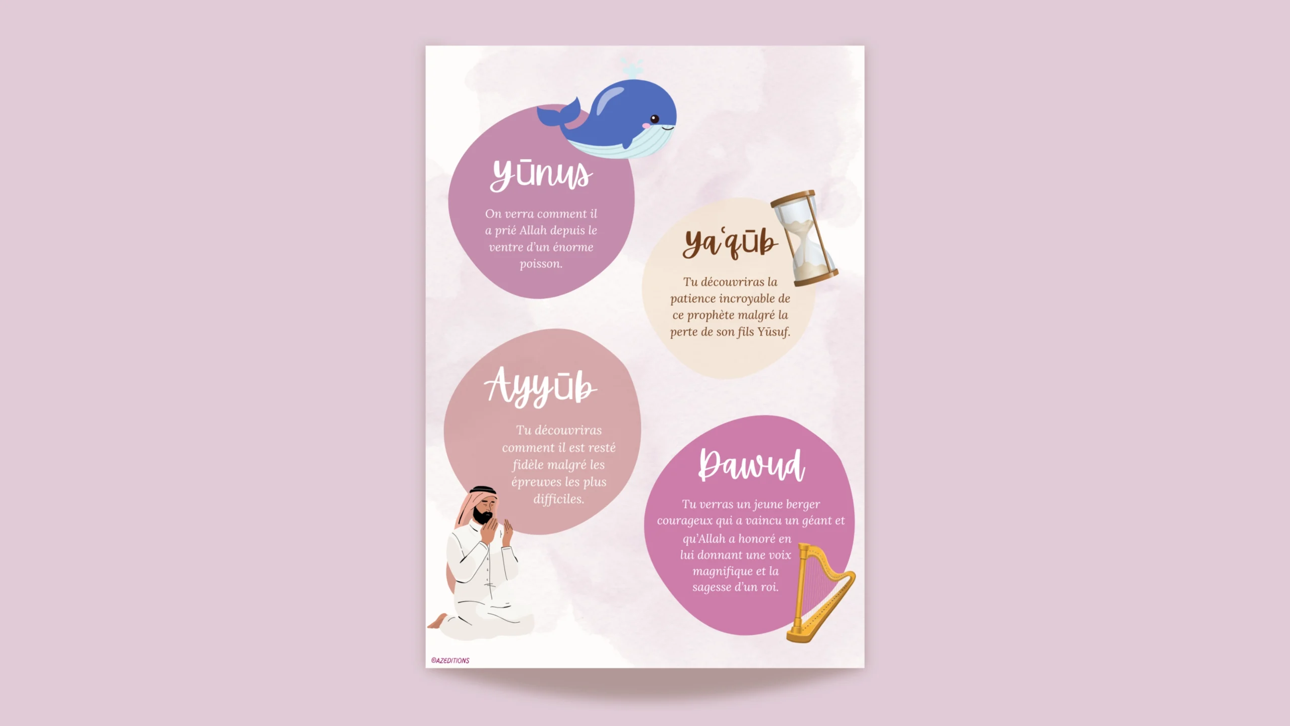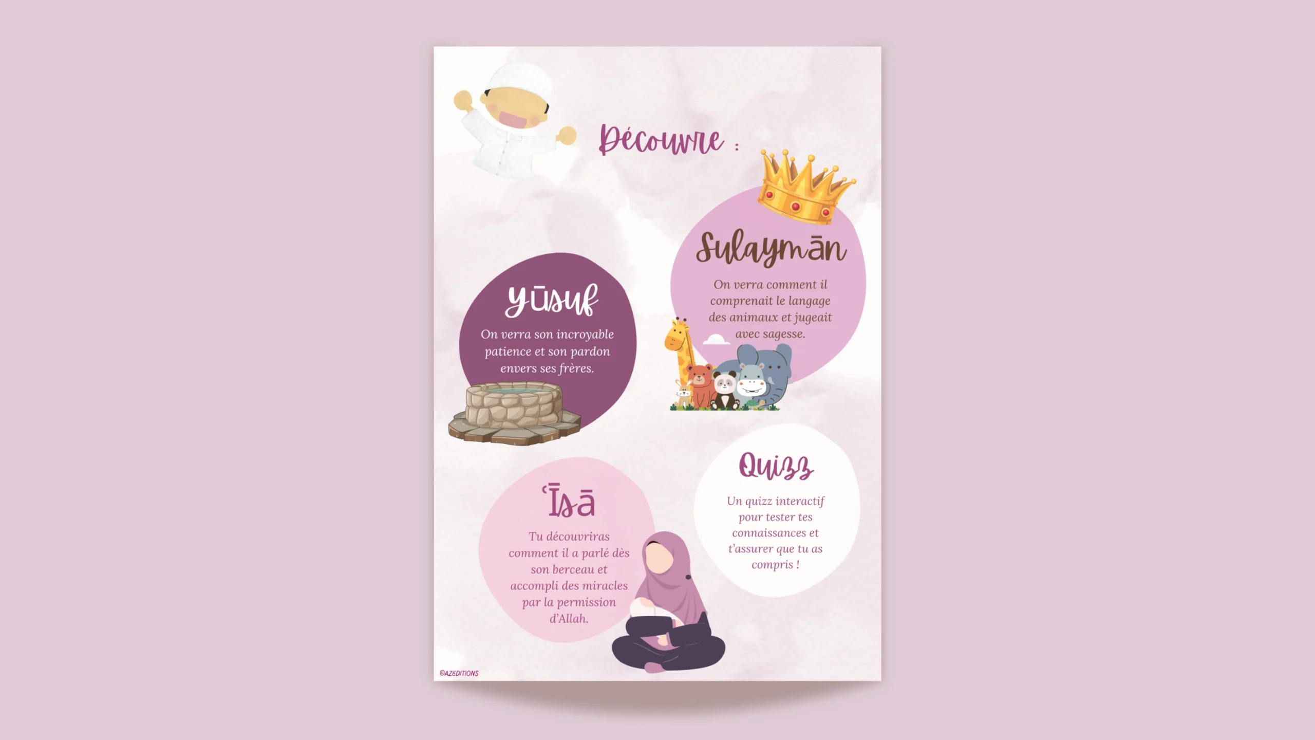 À travers des récits structurés, découpés en moments clés, l’enfant découvre les épreuves, la patience, la confiance en Allah, le courage face aux difficultés et la sincérité dans l’adoration. Chaque histoire est racontée avec pédagogie, retenue et respect.