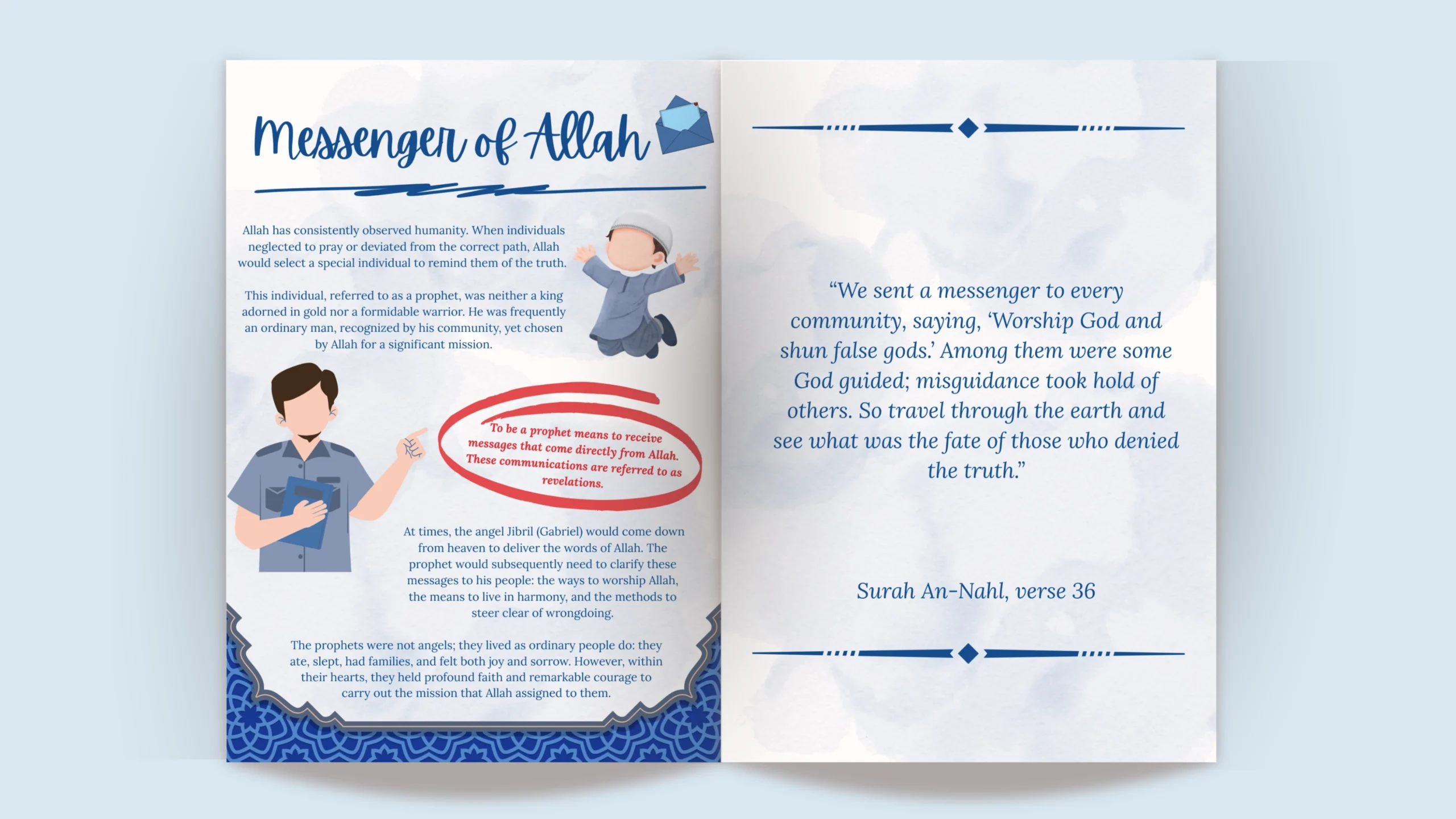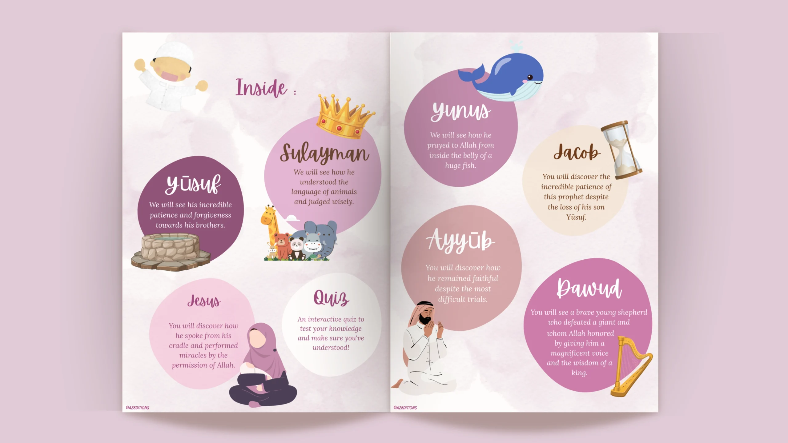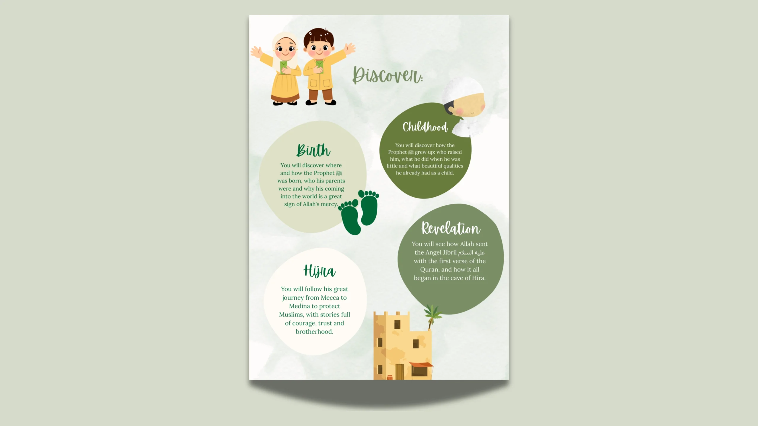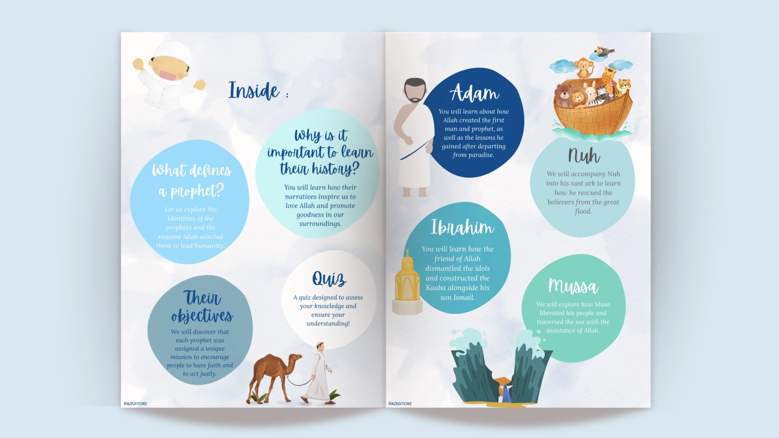 Children begin by discovering the basics of the religion, then gradually move towards the stories of the prophets, spiritual values, and practical teachings to integrate into their daily lives.