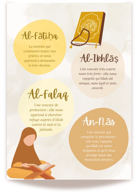 Dans ce tome, je partage avec toi les petites sourates que l’on récite chaque jour : AnNas, Al-Falaq, Al-Ikhlas et Al-Fatiha. Leur sens profond, leurs invocations et la douceur qu’elles apportent à nos cœurs au quotidien.